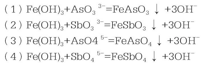 三價銻和五價銻在弱酸性至中性介質(zhì)中易水解沉淀[2], 銻酸鹽和砷酸鹽能夠與氫氧化鐵反應生成不溶于水的沉淀物, 同時膠態(tài)氫氧化鐵具有吸附作用, 能使細小顆粒的銻、砷等硫化物和氧化物一起沉淀。主要反應如下[3]: